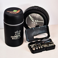 Zestaw 24 narzędzi w opakowaniu w kształcie opony samochodowej, w skład którego wchodzą: wkrętak precyzyjny PH (krzyżowy), wkrętak precyzyjny (płaski), miara zwijana 1 m, adapter (1/4”), klucz Torx – 3 rozmiary, wkrętak płaski – 2 rozmiary, wkrętak Phillips (krzyżowy) – 4 rozmiary, klucz imbusowy – 3 rozmiary, klucz nasadowy/oczkowy – 5 rozmiarów (5-9), szczypce uniwersalne, uchwyt wkrętakowy uniwersalny, magnetyczny (1/4”), przedłużka 35 mm (1/4”).