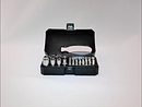 Zestaw narzędzi w pudełku. Zawiera: uchwyt wkrętakowy, uniwersalny, magnetyczny (¼”), wkrętak Phillips (krzyżakowy) – 5 rozmiarów, wkrętak płaski – 4 rozmiary, adapter (¼”), klucz imbusowy – 4 rozmiary, klucz Torx – 4 rozmiary, klucz nasadowy/oczkowy – 8 rozmiarów (5-12).